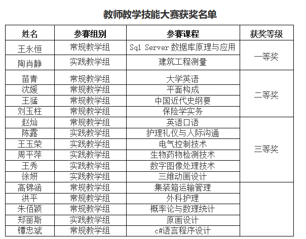 2023年学校教师教学技能大赛经过各二级学院(部)推荐、参赛教师现场展示,已经圆满结束。大赛评委会秉承公平、公正、公开的原则,共评出一等奖2个、二等奖4个、三等奖6个、优胜奖若干名。现将获奖选手名单予以公示(见附件)。公示期自2023年4月18日起至4月23日止。公示期内,如对获奖名单有异议,请以书面形式向教务处反映。以单位名义反映的应加盖公章,以个人名义反映的应署真实姓名、身份证号和联系电话,否则恕不受理。我们将对反映的问题进行调查核实,并为反映人保密。反映情况的书面意见务请于2023年4月23日之前送达教务处。