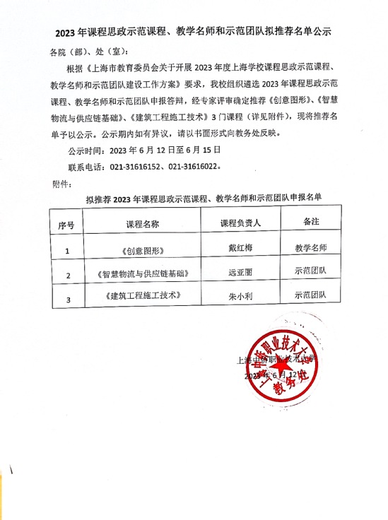 2023年课程思政示范课程、教学名师和示范团队拟推荐名单公示