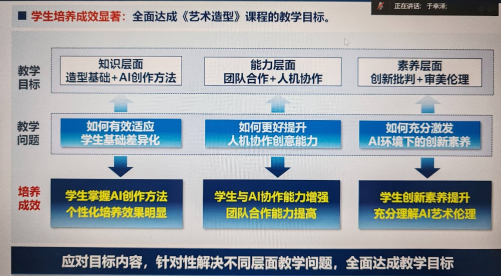 于幸泽老师介绍了三元协同、智绘共融打造的艺术造型课程,旨在培养学生跨学科思维能力和创新想象力,围绕知识、能力和素养的培养目标,以学生为中心,解构学生、教师与AI的关系,通过课程的传承与创新,在项目式学习、跨专业师资和多学科场景等教学改革以及课程思政、课程学习平台等方面取得显著成效,令人印象深刻!