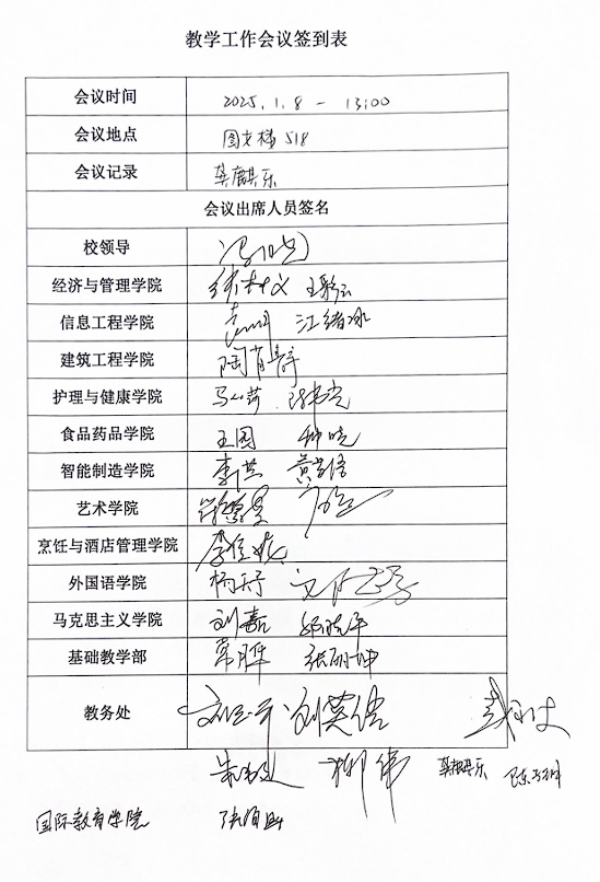 (四)落实2025年“强师工程”培训项目计划,以赛促教,遴选出更多的课程教学团队参加2025年各级各类教师教学能力大赛,提升教师教学能力和专业素养。 (五)新教务系统已上线,教师需熟悉新教学软件,确保教学活动顺利开展,新教务系统课表制作,二级学院需在1月18日前完成;严把本科毕业设计(论文)质量关。2024 年届本科生毕业设计(论文)共 654 篇,抽查 53 篇,不合格率 0.01%。2025年届本科生毕业设计(论文)要求将提高,教师需严格把控质量。教材选用需对标合格指标,需特别关注马工程教材与规划教材的选用,要特别关注职业教育新形态教材的选用。严禁监考老师缺席,整肃考风。 (六)《上海中侨职业技术大学课程重修管理规定(试行)》(中侨教字【2024】20号)从2024-2025 第二学期起执行,将涉及课程重修费用问题,需及时告知学生。 (七)关于2024版专业人才培养方案与课程教学大纲的修订。各专业需对照2024版专业人才培养方案,并按教务处下发的模板,在2025年6月前完成教学计划进程表中所有课程教学大纲的修改和编制。 (八)关于课程考试试卷归档前的注意事项,试卷归档前需有清晰目录;只对卷面成绩进行分析,要有学生考试总记录;试卷评阅需正规,采取正分或者负分制;统一使用红笔进行试卷批改;修改老师需在修改处签上自己的名字,以示负责。
