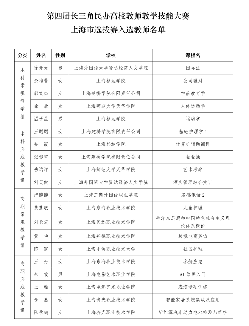 根据《浙江省教育厅 上海市教育委员会 江苏省教育厅 安徽省教育厅关于举办第四届长三角民办高校教师教学技能大赛的通知》文件要求,在市教委民办处工作部署下,上海市民办高校教师专业发展中心组织专家对各民办高校申报的88名参赛教师作品进行了线上评审。我校护理与健康学院陈露老师的《社区护理》课程进入第四届长三角民办高校教师教学技能大赛决赛。