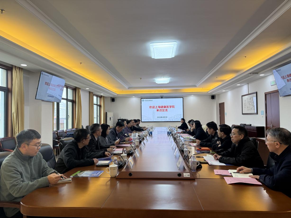 2026 年 4 月 3 日,上海健康医学院汤磊校长一行莅临我校考察交流。上海中侨职业技术大学副校长戴红梅、党委副书记朱范鑫,以及教务处、招生办公室、食品药品学院、智能制造学院、信息工程学院相关负责人出席会议。